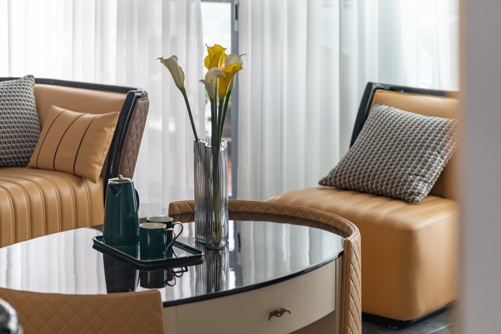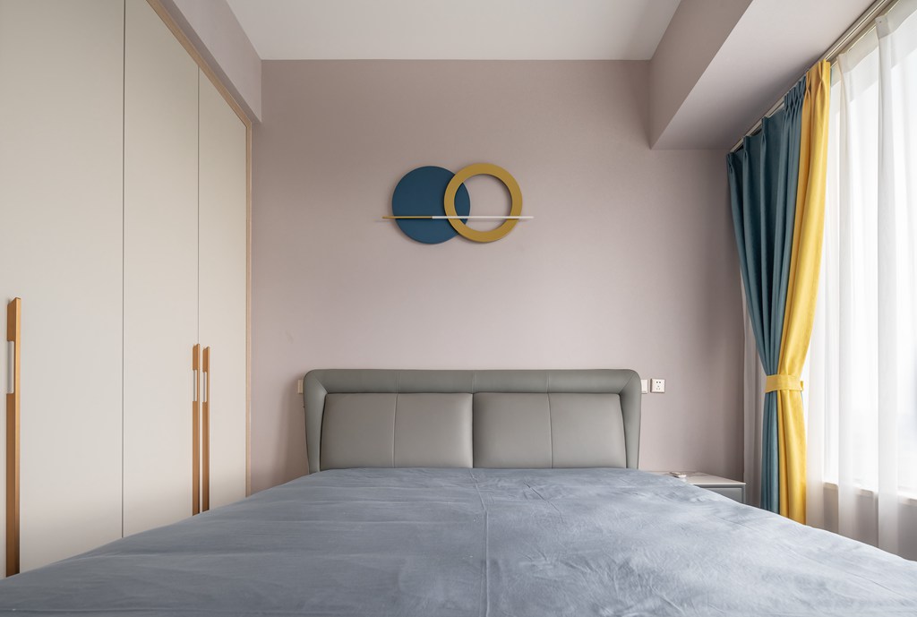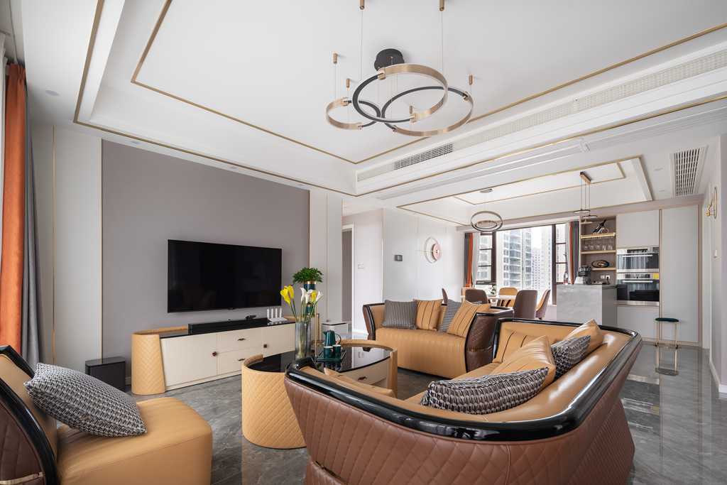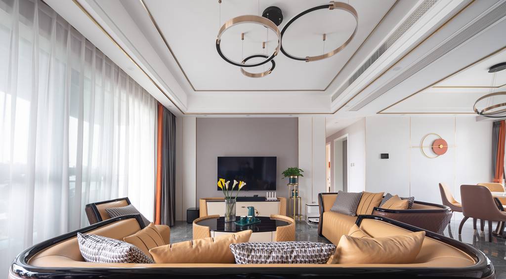 圆形金属灯具释放优雅韵味,也赋予了生活的仪式感。爱马仕橙色皮质沙发呈一定弧度落于客厅中央,将家人之间温馨聚拢,灰白抱枕进行跳色,形成丰富的视觉感官。