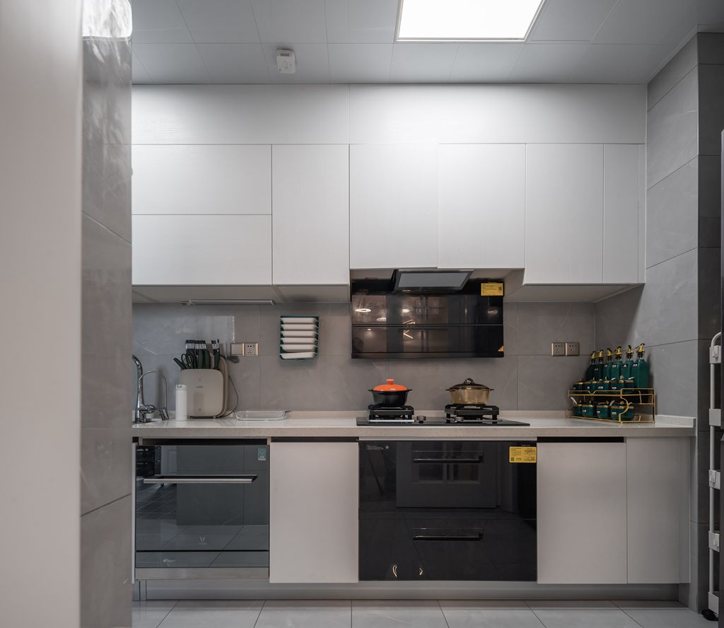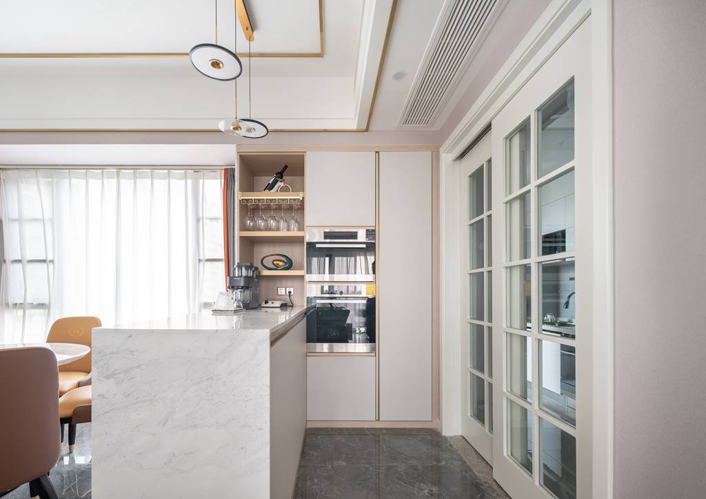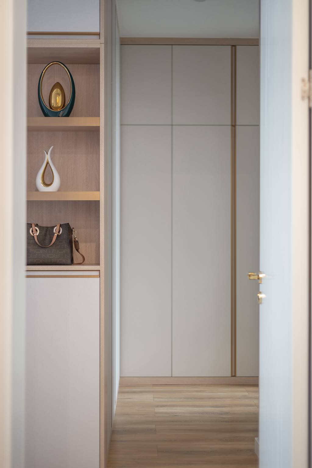 客厅空间整体以白色为主,橙色点缀其中,为空间注入活力与温度。业主喜欢轻奢质感,所以在墙面上、顶部、柜体上都有嵌入金属线条,表现出前卫的空间张力。由于原始空间沙发背后较空旷,设计师特根据业主日常喜好与后面增加休闲区,用于摆放钢琴与按摩椅,无于形中为空间带来艺术氛围。