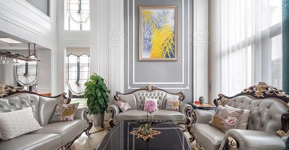家具软装则选用灰色系、棕色及蓝色系元素,整体色彩饱和,且层次丰富。落地窗的设计给了整个空间最大的视觉发挥,给原本华贵的空间增添了一份自然气息。