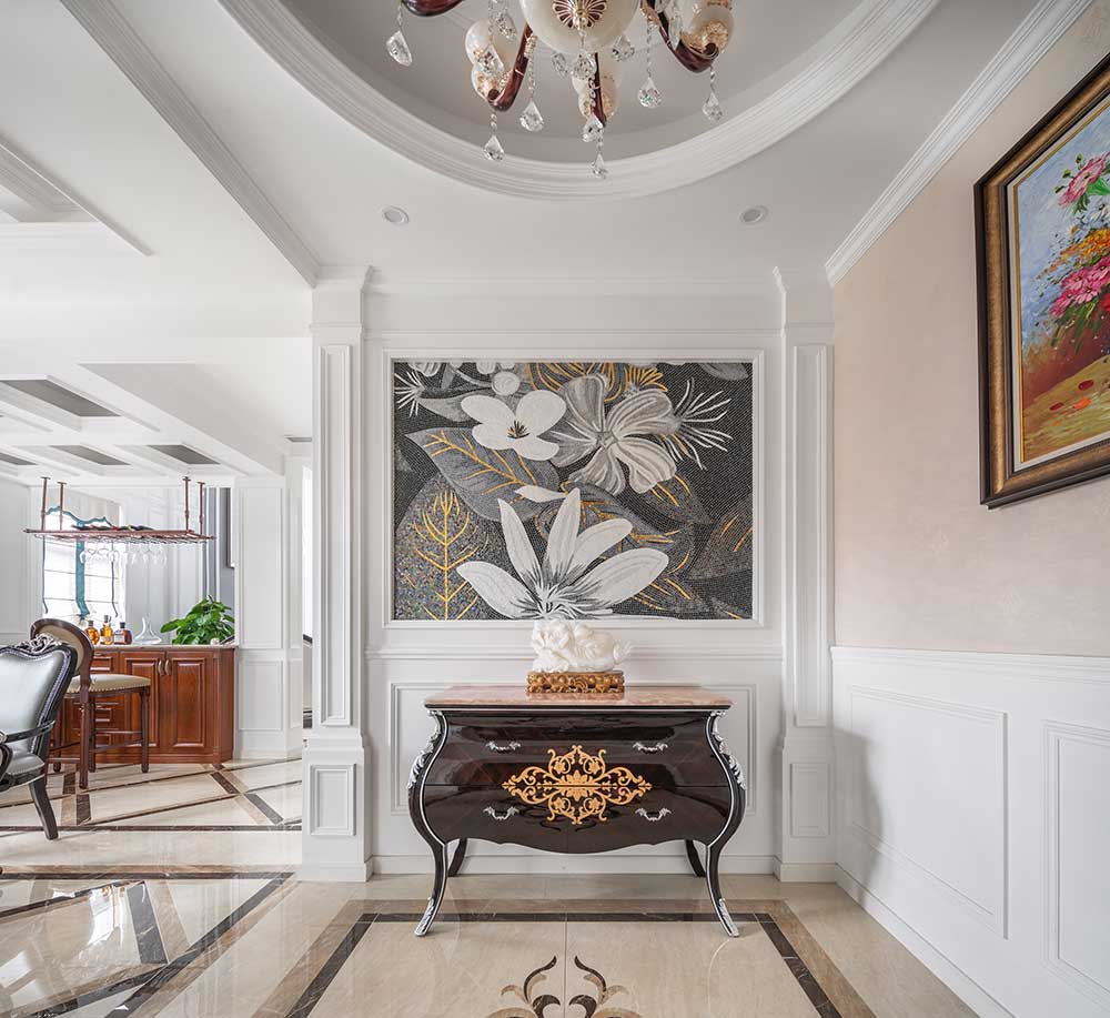 在墙面处理上,运用精心提炼过的欧式线条,材质上选用了暖色的大理石,散发着大自然的柔软、舒展的气息,营造出豪华、大气的氛围。层次分明而又精致的吊顶造型搭配气势恢宏的大型水晶吊灯,通过光线的变幻给人以高贵典雅的空间氛围。