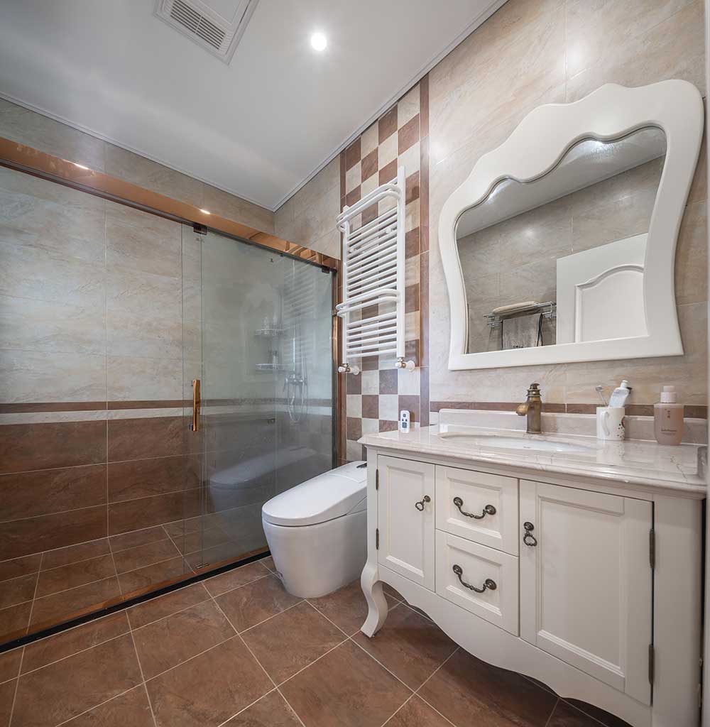 大地色的卫生间设计,给人一种复古的感觉,浴室和坐厕用一个玻璃门隔开,做到干燥、卫生。