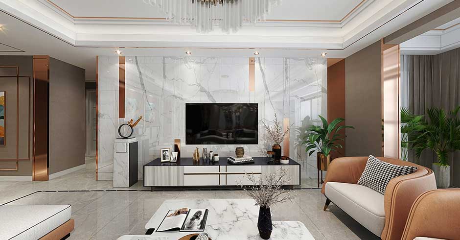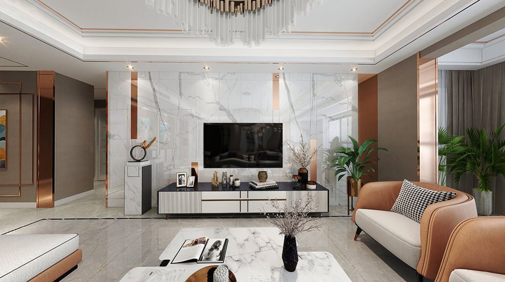 客厅主要诉求舒适大方,以优雅爵士白大理石布满电视主墙,任其滑面质感烘托自然日光。搭配金属材质,给沉闷的空间带来一抹清新,整个空间显得自然非凡。温和柔软的橘白拼色沙发搭配造型茶几,缔造出优雅奢华的家居质感。整个氛围如同室外穿透纱帘的阳光那般柔和,沉浸其中,精致的气韵在此间静谧地生长,让内心得以片刻的安放与升华。