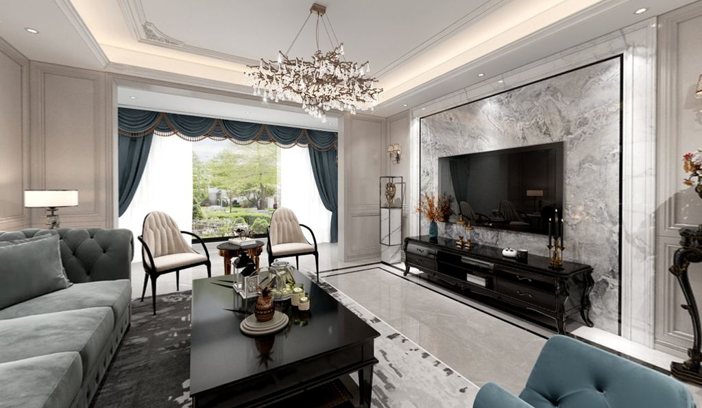 客厅设计上,现代轻奢浪漫高雅的情调适当诉诸于空间,高级灰磨砂沙发造型与雾面蓝窗帘交相呼应,电视背景墙使用大理石,不同材质的结合尽显低调奢华。