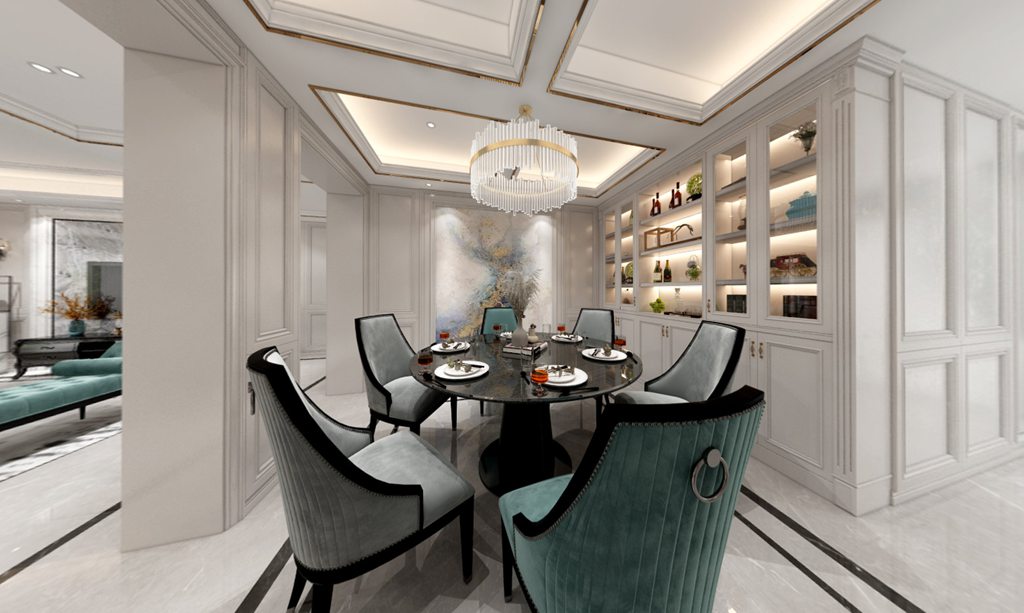 餐厅依旧搭配硬包造型,拆除部分非承重墙体做嵌入式酒柜,在暖白色灯光的照耀下更显贵气、奢华。