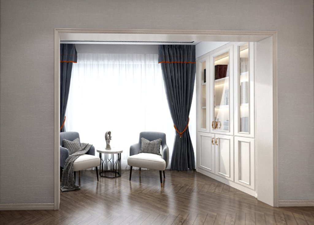 在男孩房的设计上更偏重沉稳、大气。将不同程度的灰整装到卧室,大面积的落地窗让卧室通透感更强,侧边加上整墙壁柜摆放书本与玩具收藏增加生活气息,将男孩的活泼开朗突显出来。