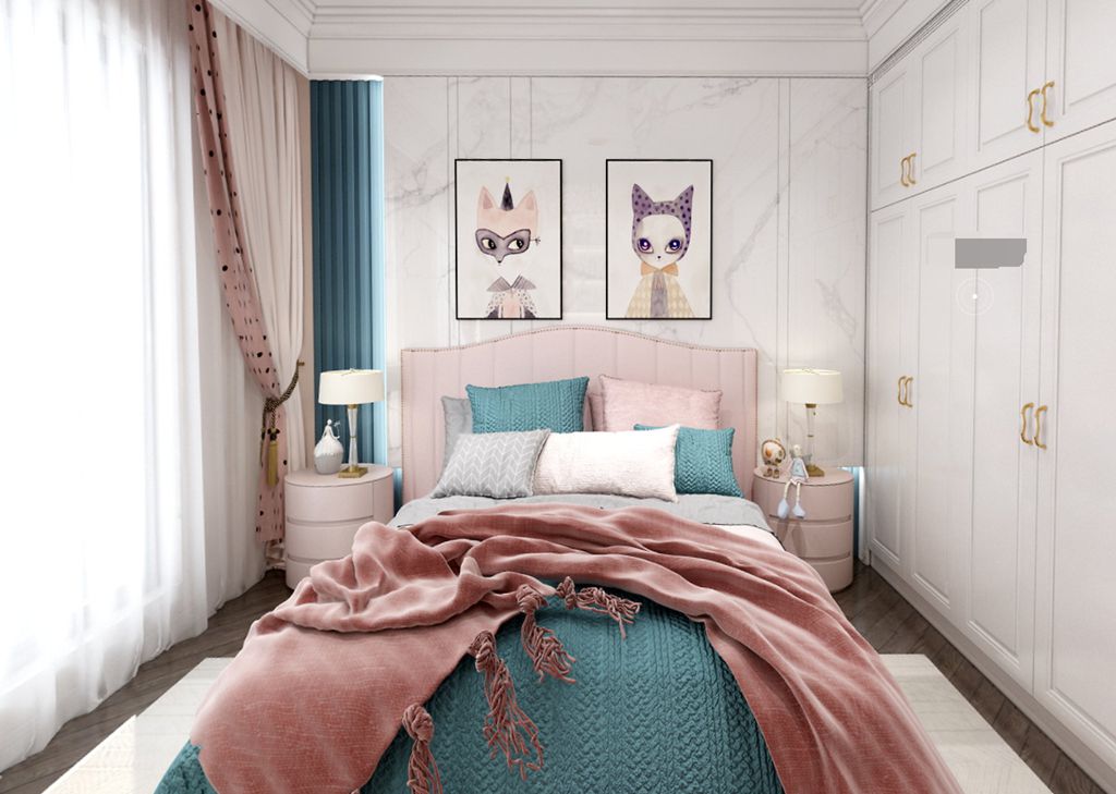 大面积的粉白色调一眼就让女孩的少女心爆发,金色金属边框与玻璃材质搭配的书桌让温馨中又带着一方从容与优雅,呈现着绝美的气度与质感。
