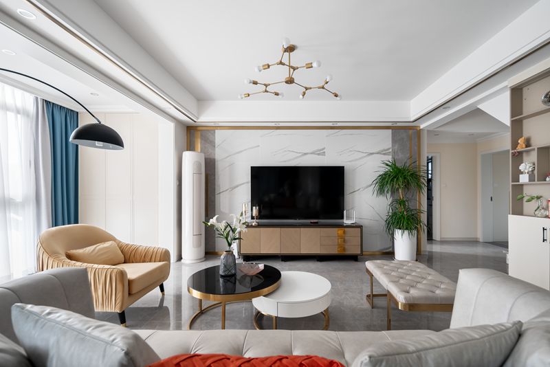 开阔式的空间布局纳入自然的光线,令空间通透而明亮。浅灰与橙色交织的皮质沙发、双圆茶几,与现代感十足的线条灯具相得益彰,当阳光漫入空间,斑驳的光影游走于其间,产生不同明暗冷暖的微妙变化,予人舒适愉悦的视觉感受。