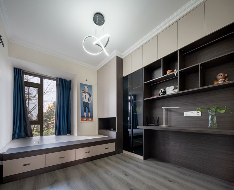 多功能室由榻榻米与办公区域组合的形式呈现,在增加储物空间的同时,屋主工作疲累时也可在此稍作休息。如有亲友临时探访小憩,这间房也可充当卧室暂用。深浅色调与材质的巧妙拼接赋予整体中式韵味,静谧典雅。