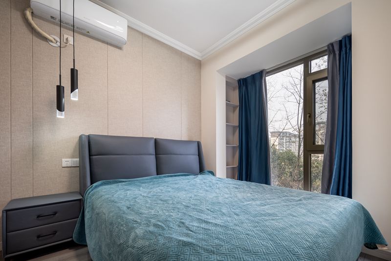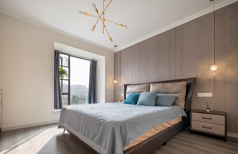 主卧的舒缓格调在柔和的设色中铺叙开来,灰色皮质床具、橙色窗帘、金属床头吊灯简单大方,在自然光线的映照中,营造出一派岁月静好的惬意。